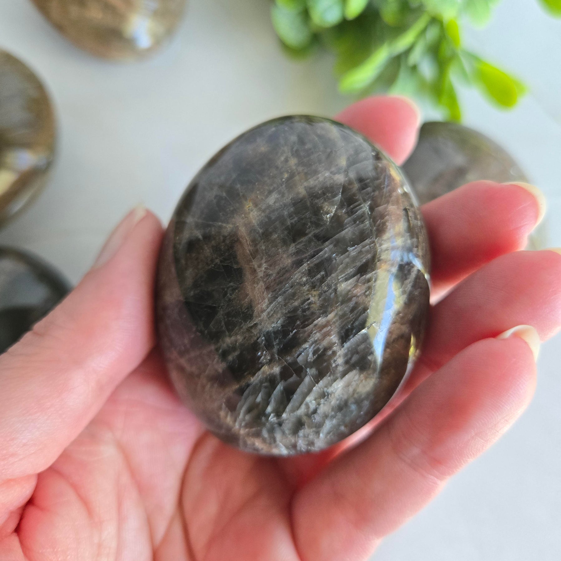 - One Black Moonstone palm stone measuring between 2 and 2.5 inches