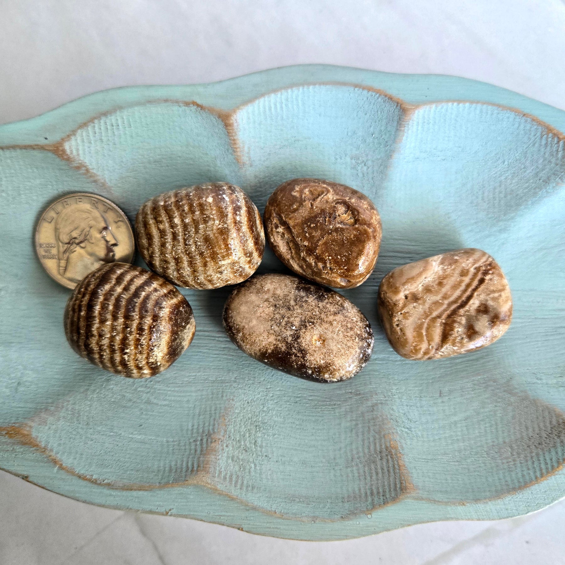 - One Chocolate Calcite tumble stone measuring about 1/2 to 1 inch