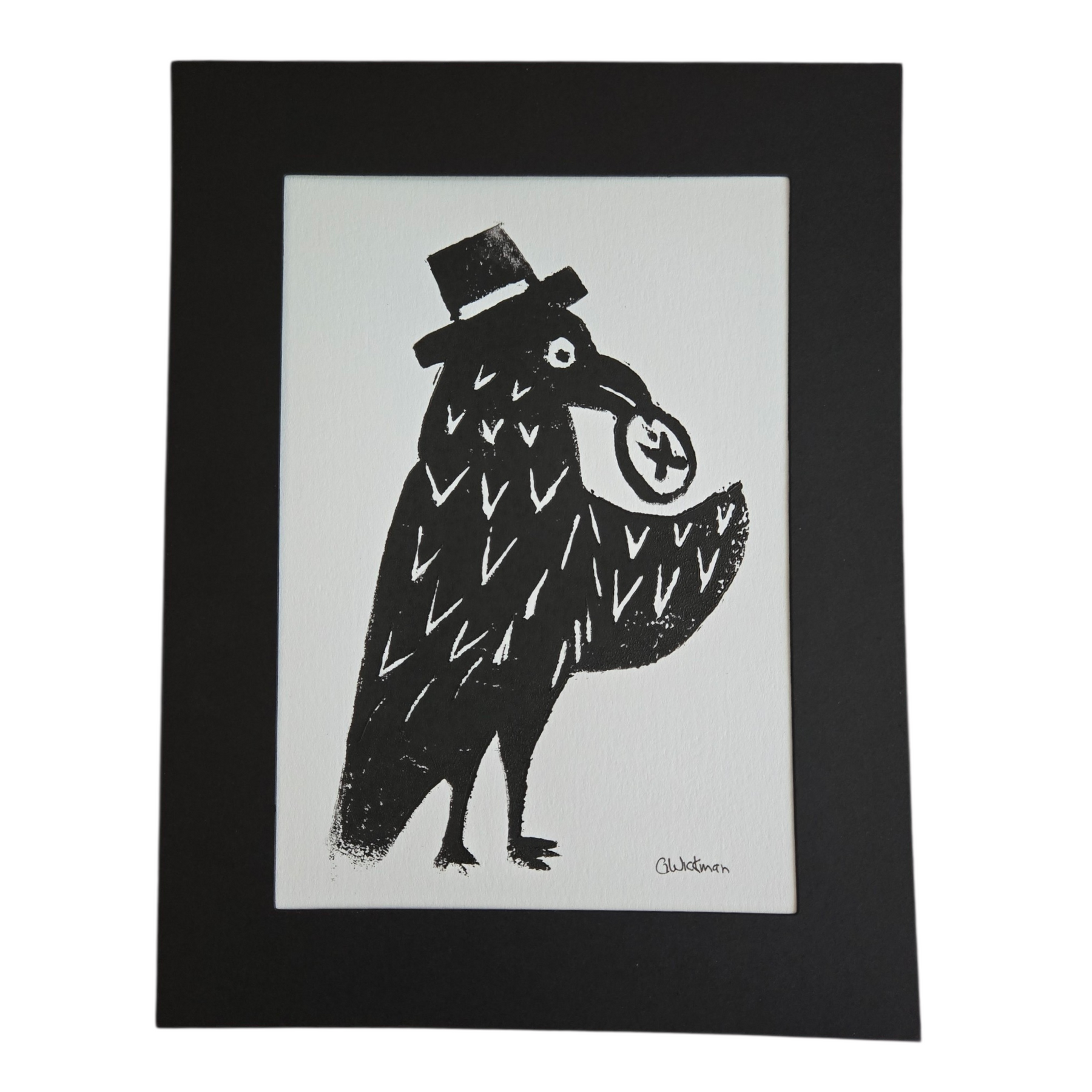 Original 5x7 inch handmade linocut print in paper frame signed in pen by artist Gloria Wickman. Includes a black mat with pop out easel. Print can also be removed from black mat. Size with mat is 6.5 X 8.5 inches. Each print is unique due to the handcrafted process. Please expect slight variations.