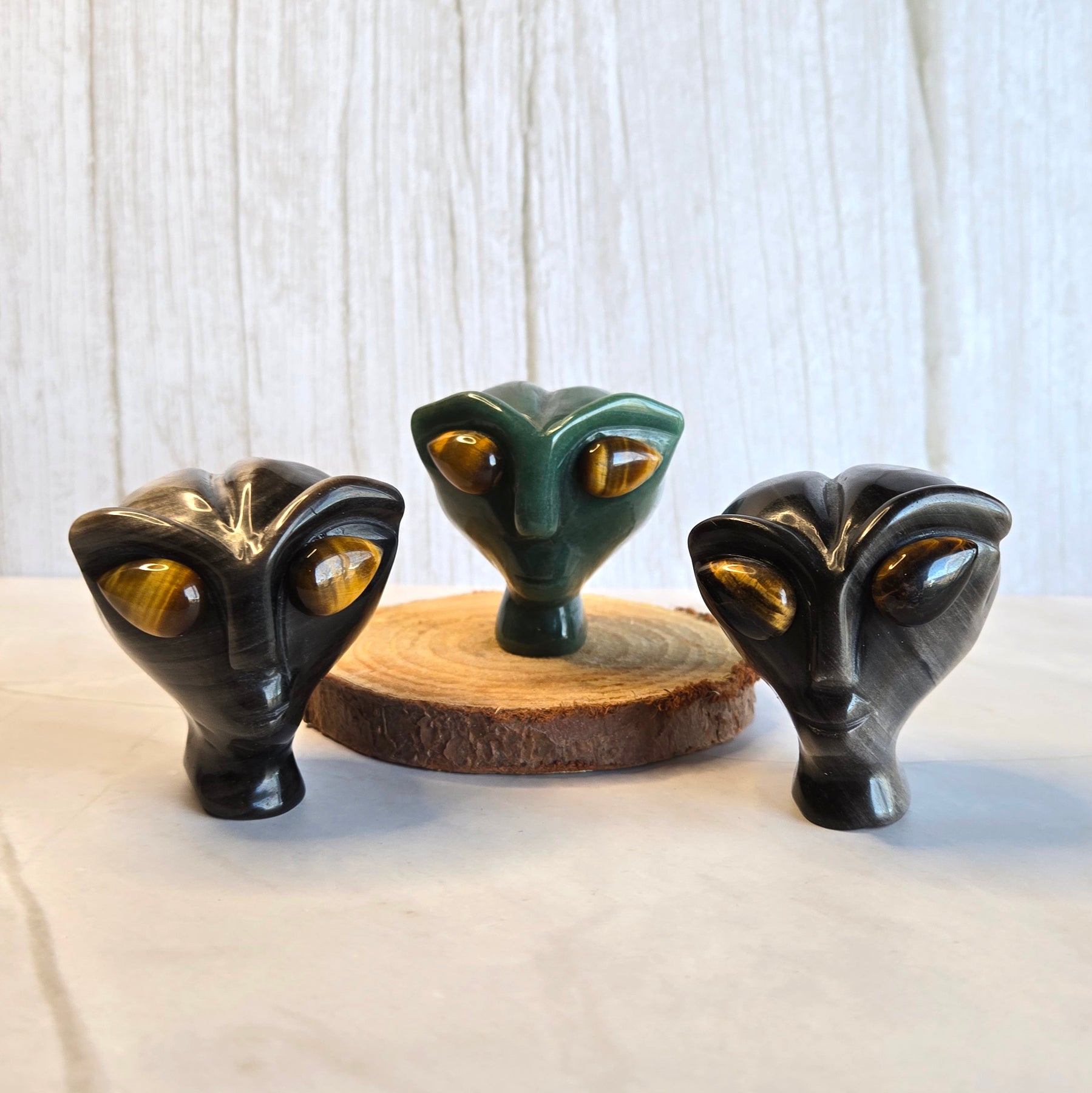 - Choice of Green Aventurine or Silver Sheen Obsidian alien head with Tiger eye stone eyes